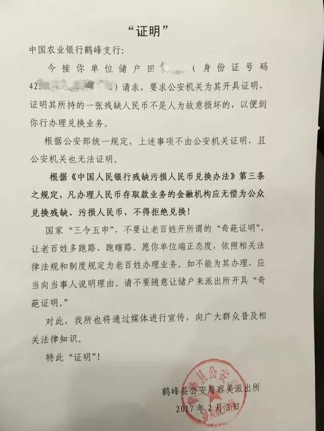 4日,一份盖有湖北鹤峰县公安局容美派出所公章的“证明”文件在网络热传。中国农业银行鹤峰支行要求办理残缺人民币兑换业务的储户,到派出所开具该人民币并非人为故意损坏的证明。对此,鹤峰县公安局容美派出所霸气回应。