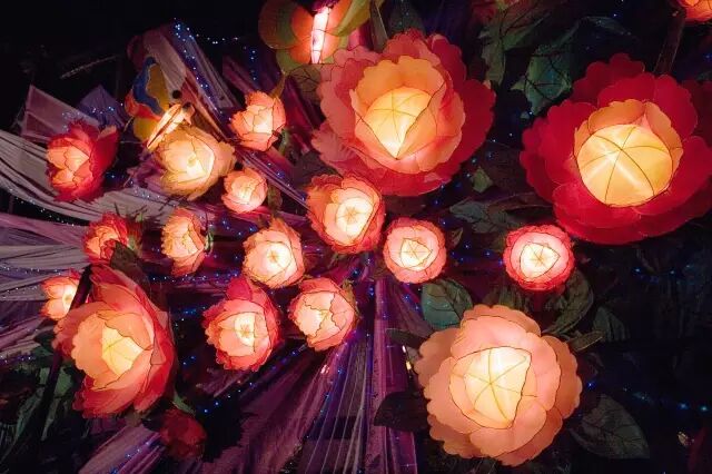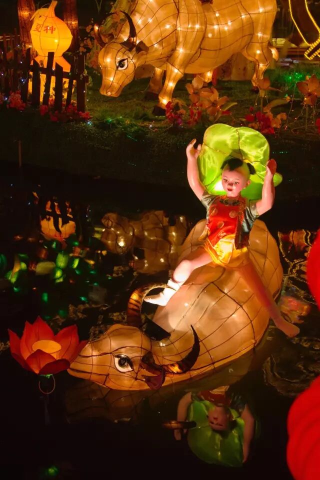 核桃灯、荷花灯,灯楼高挂;青狮灯、白象灯,灯架高檠。