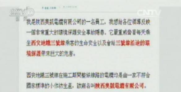 日前,一名自称是“陕西奥凯电缆有限公司员工”的网友发帖称:西安地铁三号线存在安全事故隐患,整条线路所用电缆“偷工减料”,西安某电缆公司“以次充好”,将70平方的电缆用95平方型号进行包装并提供给地铁施工方,会造成电缆电线的发热过大,不仅会损耗大量动力,还可能发生火灾。