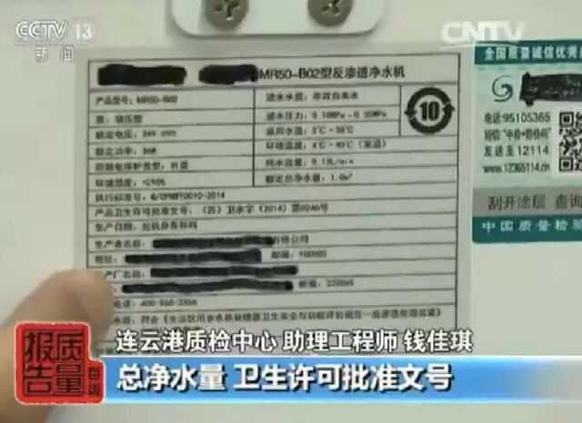 检测人员表示,净水机标签说明书上多项信息,对于消费者的选购和使用都至关重要。据介绍,合格的标签应该标注净水流量、总净水量、卫生许可批准文号和产品执行标准。