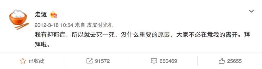 “我有抑郁症,所以就去死一死,没什么重要的原因,大家不必在意我的离开。拜拜啦。”