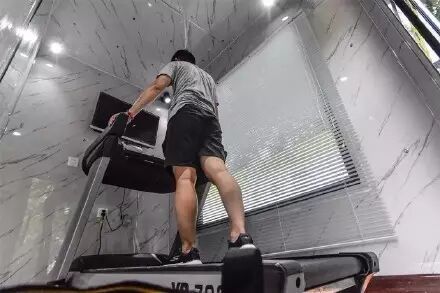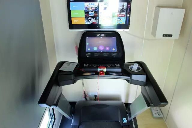 仓内中心位置摆放着一台跑步机,周边配有镜子、挂钩、播放屏幕、温控系统、空气净化等设施,运动仓内温度适中。用户可通过屏幕联网聊天、听歌、观影、收发邮件。