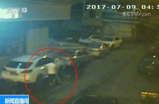 嫌疑男子在车内停留两分钟后才离开。根据视频监控,警方发现这名男子在附近街道徘徊时,经过的每辆车他几乎都会去拉一下。据统计,案发当晚,仅在这条街上这名男子就拉开了七八辆车。