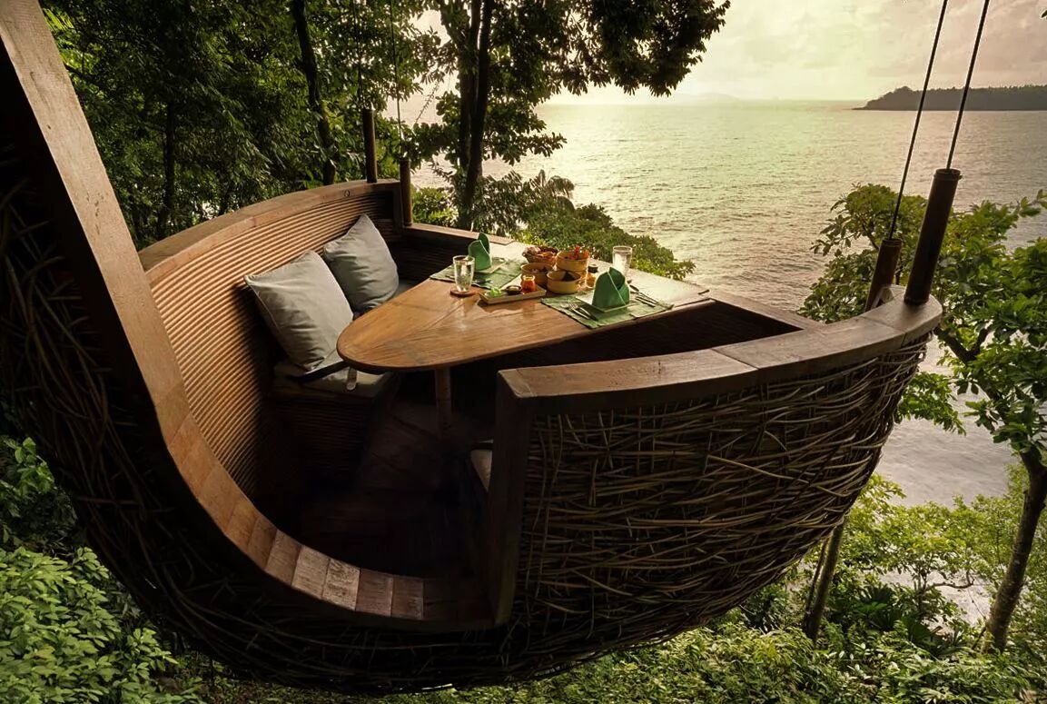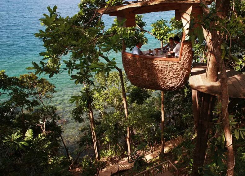 进去之后,树屋会升上树顶,四周景观非常开阔。而食物则是由服务生以钢索绑在身上从森林的另一头滑翔飞过来的。如此令人惊叹的高空服务,你是否已迫不及待想要感受一番呢~美食美景加上丛林半空的用餐体验,绝对是每一个到这里的客人不能错过的。岛上独一无二的树顶餐厅可是很难临时预订的,大家请记得提前预定哦!