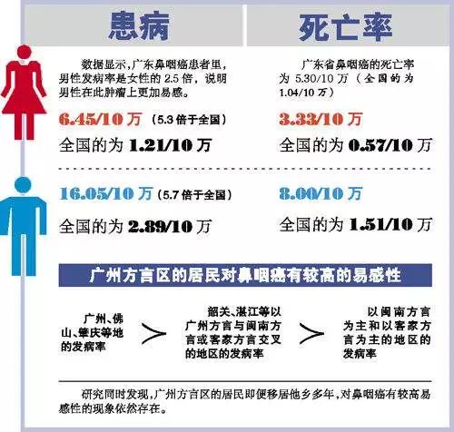 世界卫生组织调查报道,全球有80%的鼻咽癌患者在中国。鼻咽癌主要发生于我国南方五省,即广东、广西、湖南、福建和江西。其中,广东的中部和西部的肇庆、佛山和广州地区,鼻咽癌发病率更高,因此,鼻咽癌又称“广东癌”。鼻咽癌的发病年龄由20多岁开始,逐渐上升,45至60岁为最高峰。