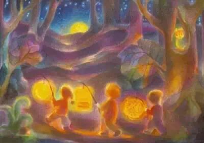 她低头看到她手里的灯笼里竟然有一股明亮、强壮而挺拔的火苗在燃烧着。“啊!太好了!” 她叫了起来。“现在我可以把你带回村里了”。她牵着小男孩的手,周围的小路清清楚楚在眼前,因为她的灯笼把一切都照得很亮,很远。