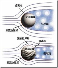 2、由于摩擦力的作用,球体表面上有一层薄薄的流体边界层。在球体的表面上,边界层里的流体对球体的相对速度为0。在边界层中,离球体表面的距离越远则流速越快。在球体旋转的状况下,因为球体上方的流速增大而下方的流速减小,所以球体上下方的流体就产生压力差。此外球体上方的分离点会被推向更后方。