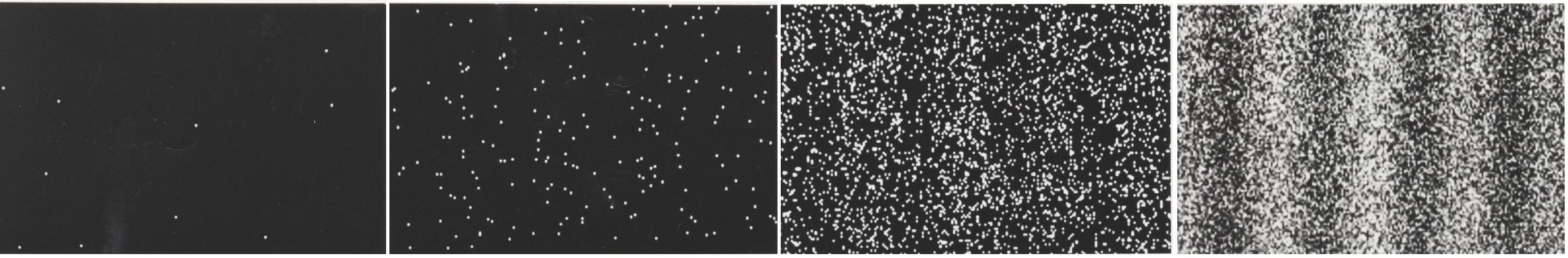 图3. 电子的双缝干涉: 单电子发射,积累不同时间后的电子分布。[维基百科:干涉(物理学)]
