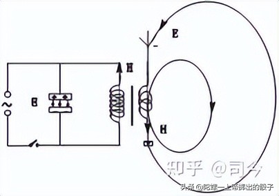 由此可见,电磁波发射天线由“线圈+电容器”变成“直导线+电容器”,它们发射时产生磁场的物理机制是不一样的,前者遵循法拉第电磁感应原理,发射器中磁力线与电力线平行;后者则遵循安培导线电流磁场原理,电力线与磁力线垂直,前者线圈感应磁场是后者导线电流磁场的叠加态。
