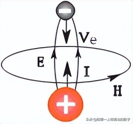 如果将“直导线+电容器”物理模型再改造,那就是偶极振子模型,如图-16所示,正负电荷相互振动可以发射电磁波,并由此认为单个电子运动也辐射电磁波;由于电磁波是一种能量,因此,经典电磁学在解释卢瑟福原子行星模型时就提出了一个谬样推理:电子绕原子核作匀速圆周运动,因电子运动方向不断改变,因此电子圆周运动可以看做是一种匀加速运动,这种运动应该会使电子不断地向外空间辐射电磁波能量,所以电子运动能量就会逐渐减少,即运动速度变小,最终电子会落入原子核上,由此推理原子核与电子构成的原子就不可能稳定存在了,而事实是原子一直稳定存在,如图-17所示;为了解决这个问题,后来玻尔提出了氢原子量子化模型。