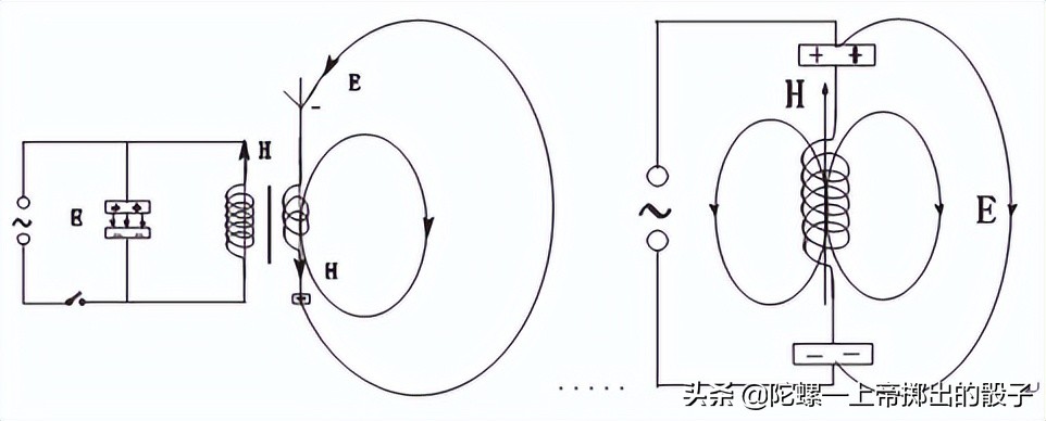 由此可见,电磁波发射天线由“线圈+电容器”变成“直导线+电容器”,它们发射时产生磁场的物理机制是不一样的,前者遵循法拉第电磁感应原理,发射器中磁力线与电力线平行;后者则遵循安培导线电流磁场原理,电力线与磁力线垂直,前者线圈感应磁场是后者导线电流磁场的叠加态。