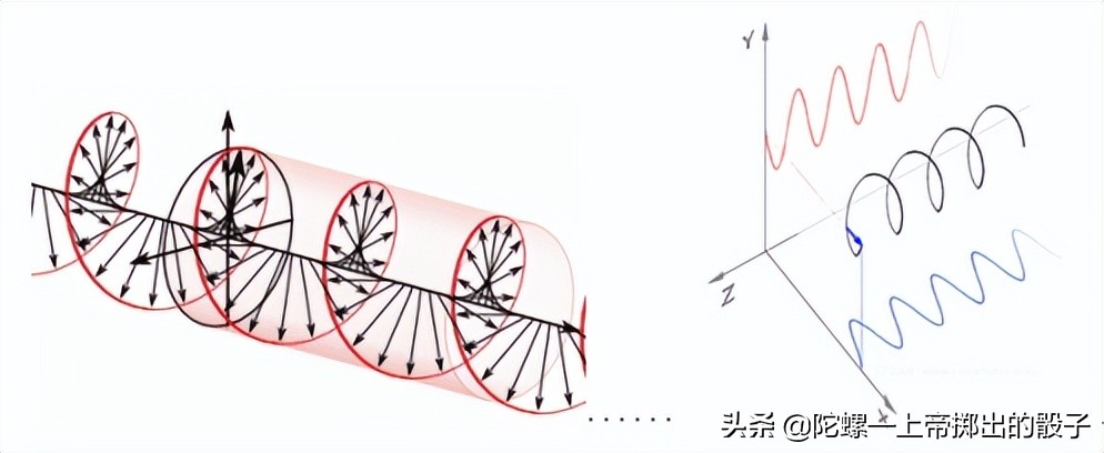 可见,谐振子振幅矢量产生的平面波可以描绘成余弦波,而余弦波曲线又可以看做是柱螺旋曲线的一个正投影,柱螺旋所代表的运动可以描述成一个谐振振幅矢量圆平面沿垂直波方向做匀速运动的合成,这正是一维谐振子转换成用矢量圆描述的重要性之根本所在。
