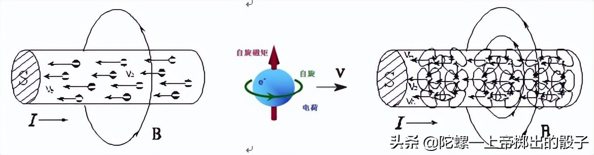 至于电流导线为什么能够产生磁场问题,当时的经典电磁理论确实无法从物理机制上给予合理解释,但随着科学发展,这种现象就可以用量子力学中电子自旋磁矩问题给予很好地解释了,即电子自旋磁矩是电子的内禀性,如图-19所示,它在运动中这种内禀性磁场也会随之对外界展现出来,也就是说单个电子匀速率运动是一种带有自身电场与磁场的运动,金属导线电流能够对外表现出磁场性正是电子自旋磁矩耦合的宏观磁场效应,如图-20所示,这种电场与磁场都是电子自身固有的物理属性,它们不不会对外产生辐射,否则电子也就不可能稳定存在了。