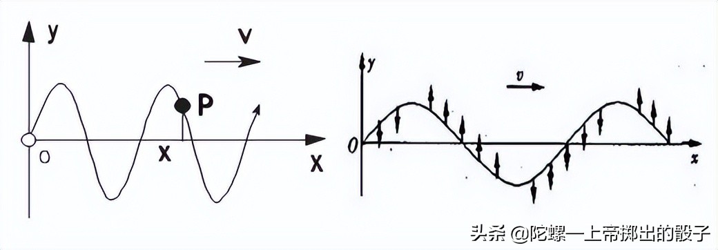 值得注意的是:简谐波上组成点可以看做是谐振动中的振子,振子本身在波传播方向上没有平动,只在波形上下振动(横波)或左右振动(纵波),如图-6所示。
