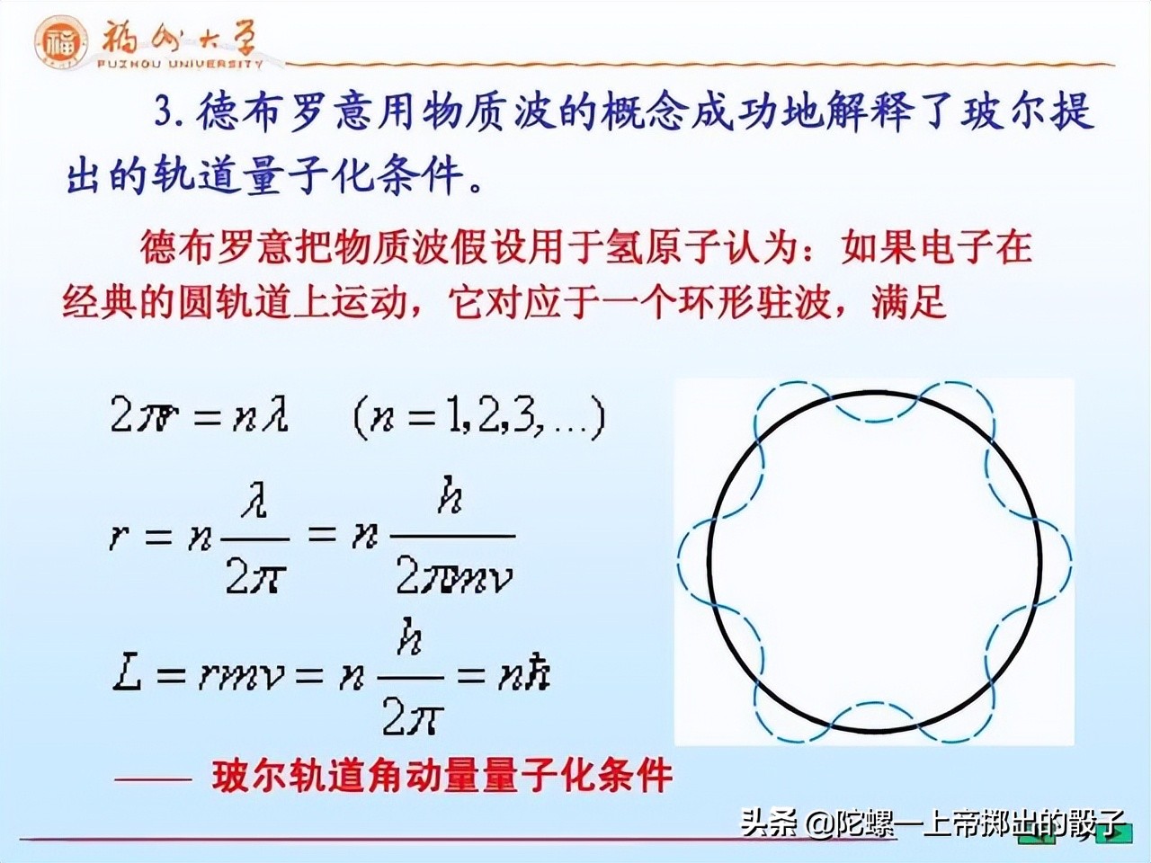 如图-30所示,按照德布罗意假设,与匀速运动的实物粒子相伴随的波之波长为:λ=h/p,p=mv,所以有λ=h/mv;这种波叫做德布罗意波,P=h/λ或λ=h/mv叫做德布罗意公式,他给出了与实物粒子相联系着的波,其波长和粒子质量、速度之间的关系。