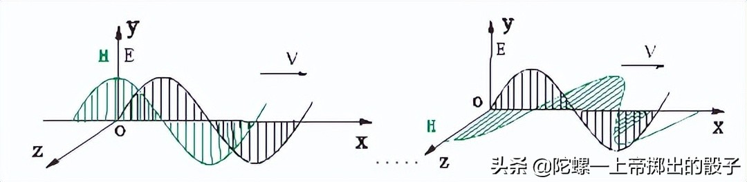 偶极子振荡之所以能够发射电磁波,是由于它是开式LC振动的简化版,这种振动所发射的电磁波是以v速沿着球体矢径r方向传播的,由于电场E与磁场H相互垂直,且E和H的振动方向都与电磁波传播方向垂直,且E和H的振动相位相同,即它们在空间传播中,E和H是同步增大或减小的,因此,电磁波的运动方程常以E和H二个平面波方程的形式给出,即