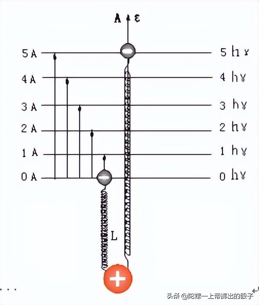 如图-25所示,假设谐振子振幅A1下对应的谐振能量为E1=h1γ,那么振幅A2下对应的谐振能量就为E2=h2×γ=2E1=2h1×γ,.振幅A3下的振动能量为E3=h3×γ=3E1=3h1×γ……以此类推,振幅为An下的振动能量就是En=hn×γ=nE1=nh1×γ.