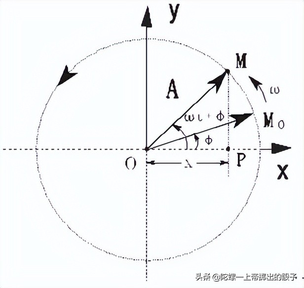 在t=0时刻,矢量A的矢端在M0位置,它与ox轴的夹角为φ;在任意时刻t,矢量A的矢端在M位置。在这过程中,矢量A沿逆时针方向转了角度ωt,它与ox轴间的夹角为ωt+φ.由此可见,这时矢量A的矢端在ox轴上的投影为x=Acos(ωt+φ),当然,矢量A在oy轴上的投影是y= Asin(ωt+φ),与谐振运动方程微分形式的解x=Acos(ωt+φ)比较,矢量A的矢端M恰是沿x轴作作谐振动物体在t时刻相对原点o的位移。因此,旋转矢量A的矢端M在ox轴上的投影点P的运动,可表示物体在ox轴上的谐振动。旋转矢量A以确定的角速度ω旋转一周,相当于谐振动物体在x轴上作一次完全振动。因此,旋转矢量A旋转一周所需要的时间与谐振动的周期相等。在t=0时刻,A与ox轴的夹角φ对应于谐振动的初相,在t时刻,A与ox轴的夹角ωt+φ则跟谐振动的相位相对应。