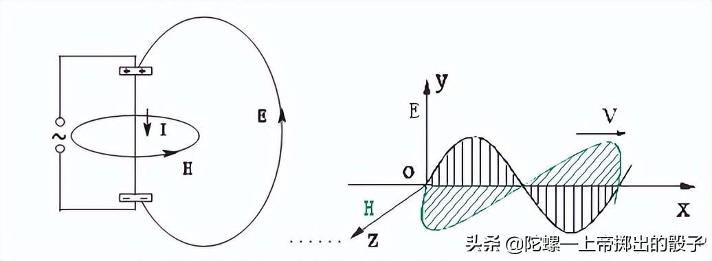 为了更有效发射电磁波,现代将开式LC振动电路中电容器里的线圈改成细金属导线,以发射波长更短的电磁波,如图-14所示;这里,金属导线电流会产生环形闭合磁场,而这个磁场方向与电容器电场方向并不在一个平面,而是相互垂直,即H⊥E,而且导线电流越大,环形磁场越强,即电场与磁场强度变化的相位差为0或π,这就是我们教科书经常给出的电磁波图形,如图-15所示。