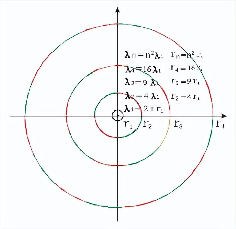 可见,不同稳定轨道周长之间按n=n²×r1规律拓展的本意是,电子第一轨道周长是λ1=2πr1,第二轨道周长就是第一轨道周长的4倍,即λ2=4×2πr1,第三轨道周长就是第一轨道周长的9倍,即λ3=9×2πr1……以此类推,第n轨道周长就是第一轨道周长的n²倍,即λn=n×2πr1,n∈[1、2、3、4…….],现将这种轨道周长按n²倍式拓展形式绘成图,如图-1所示。