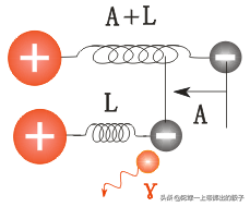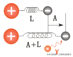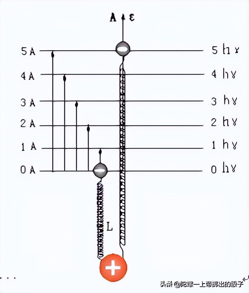 现在再假设,一维电子谐振子处于振动态时距质子的最大距离为L+A,如图-5所示,当这个振动系统释放一个能量为ε=hγ的光子时,它的谐振动停止,又处于距质子距离为L的稳定态,对这个振幅变化过程用旋转法描述就如图-2所示。