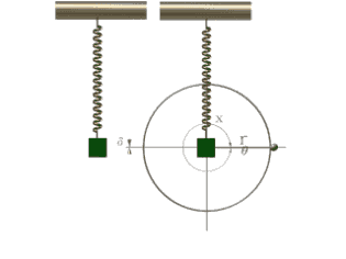 既然一维谐振动可以用旋转矢量圆来描述,那么,对一个做圆周运动的质点而言,如果将它的旋转半径看做是一个矢量,则这个质点的圆运动也应该可以看做是一种谐振动,如图-6所示。