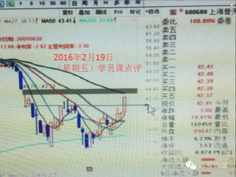 【操作策略】对反抽无力、业绩暗淡、退市危机与主力调仓的品种,积极借机做好调仓换股的动作,精选优质个股(低价天量、拦腰斩半再打折、凤落梧桐待朝阳等完美上攻模型),认 真作图分析,待回调按切入法则是低吸的良机会!如同我们在2月19日(周五)晚间学员课程中点评标的(600680)上海普天,今日盘中再度冲击涨停板。 所用方法:运筹点金课程中低三大模块【操盘利器】中的18KD指标背离双谷金叉+底部形态黄金右脚所选标的,本周一至今日最高已飙涨30%。2月19日课 堂点评原图如下: