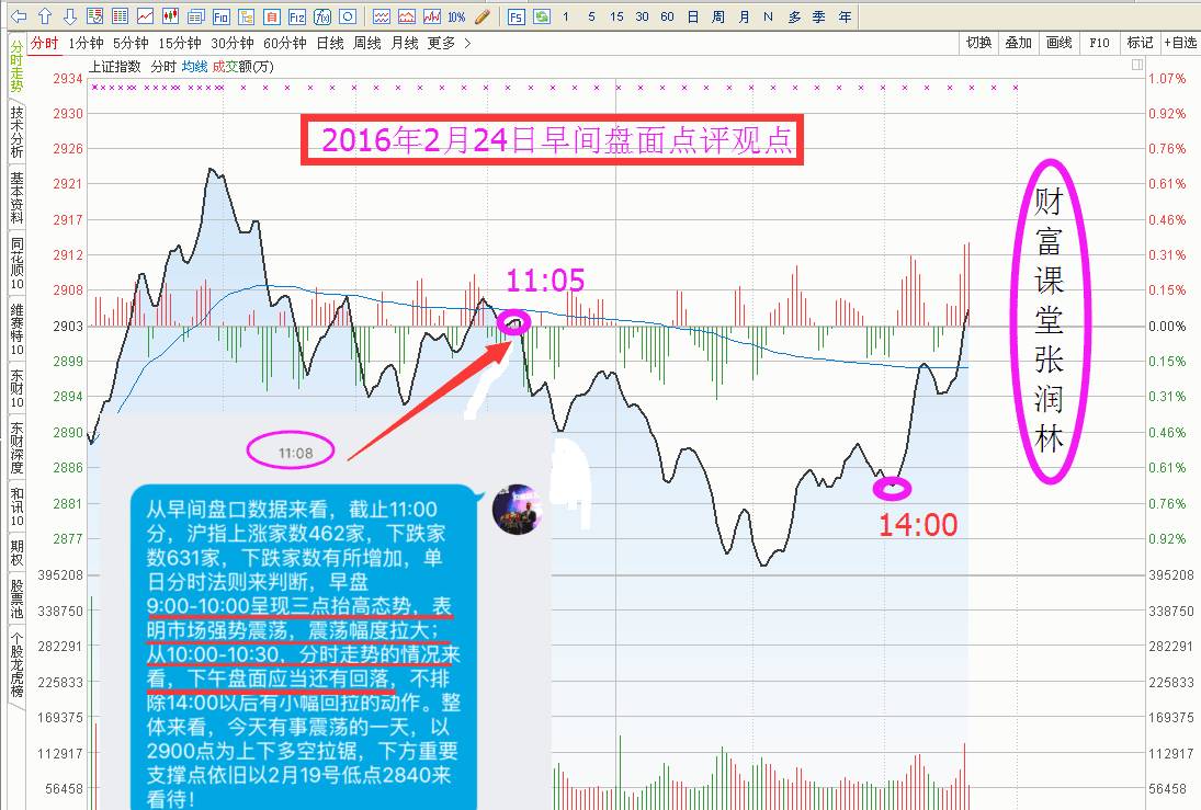 当然,财富课堂张润林今日早盘也通过【运筹点金】第二大模块火眼金睛中的单日分时法则给各位学员做个盘面点评,点评如下:
