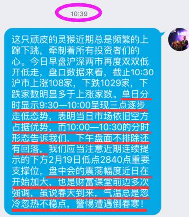 今日早间,财富课堂张润林也通过文字方式告知学员们的短线风险,只是短线的下跌空间超出了想象,直接击穿了2月19日低点2840点,失守2800点,原文截图如下: