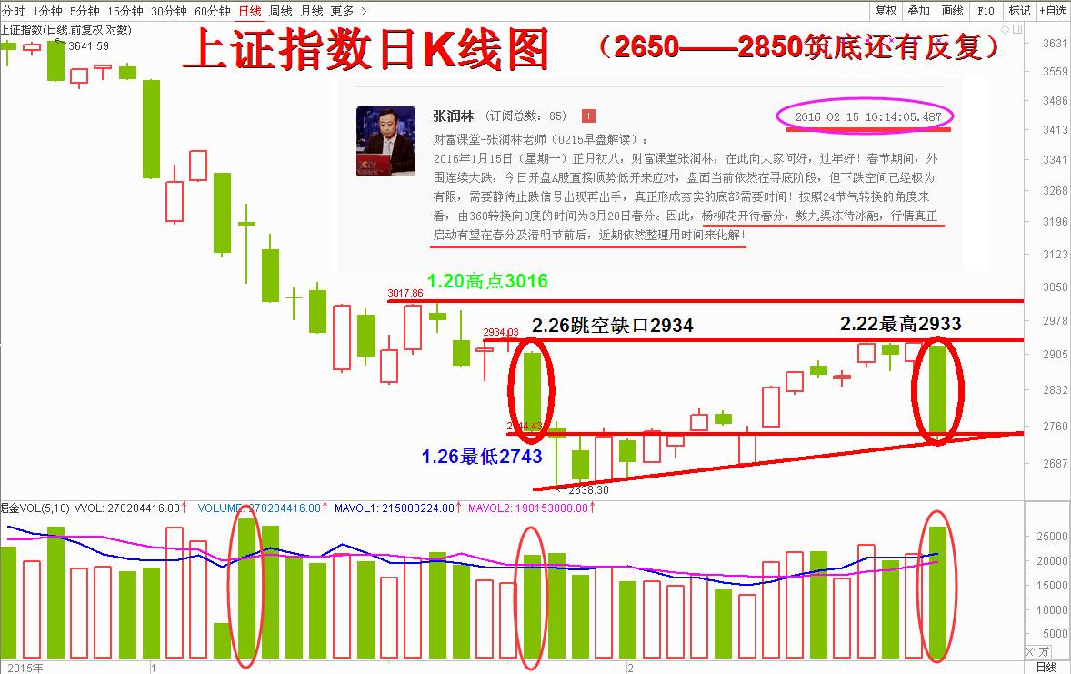 技术而言,1月26日的一根破坏长阴,刚刚通过15个交易日的时间来化解,还差临门一脚收复2934点。也是财富课堂张润林多次提及的:2934点—3016点面临技术性压力,压力不轻,存在一定的震荡整理需求。今 日却再来一根破坏的长阴走势,筑底将进一步用时间来化解。短线方面,我们应该注意观察1月27日低点2638点与2月15日2682两点之间的连线处是否 可以得到支撑是很关键的问题。在财富课堂张润林来看,市场筑底还有反复,节后的第一天(正月初八),财富课堂张润林就有讲,真正的行情启动有望在春分及清 明节前后,盘面日K线图形如下: