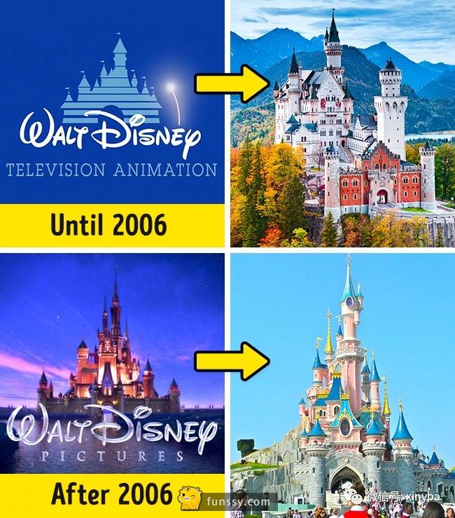 童话王国迪士尼的logo在2006以前是以位在德国的新天鹅堡为灵感来源,之后才是以自家的巴黎迪士尼城堡