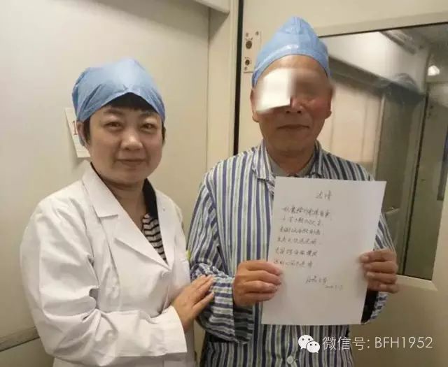 陈大爷是位退伍军人,参加过好多战役,我们都说他是模范病人,术前、术中和术后都配合得相当好,手术又快又顺利,第二天视力0.8。打开纱布后陈大爷特别得高兴,即兴赋诗一首送给我们,长这么大还是头一次收到诗呢。