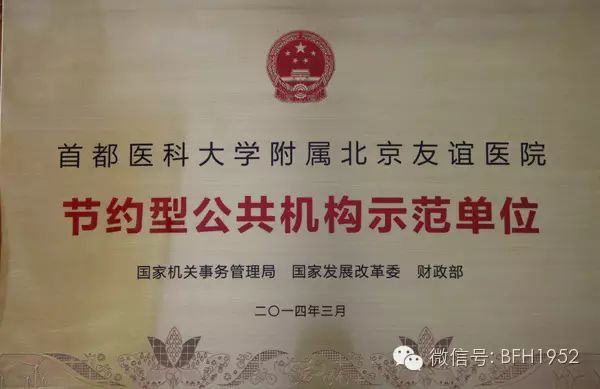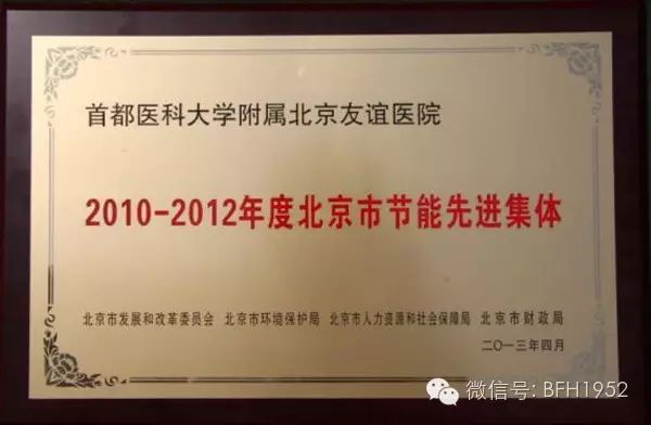 2012年和2013年,北京友谊医院先后获得北京市节水先进医院和北京市节能先进集体两项市级荣誉称号,在2014年获得国家级称号——节约型公共机构示范单位。2015年,科室水电费用列入了综合目标管理绩效考核指标。近期,北京友谊医院作为卫生计生系统唯一一家单位被北京市发改委确定为2016年节能环保地毯教育示范基地创建单位。