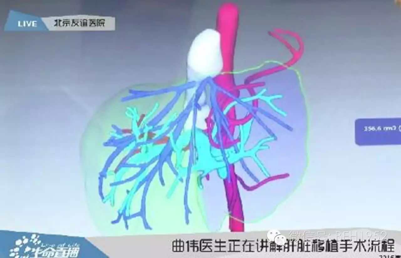 10:00,两台手术分别由两位经验丰富的肝移植专家朱志军、魏林带领两个团队同时进行。直播间,曲伟医生正在用三维电脑模型讲解手术进程。