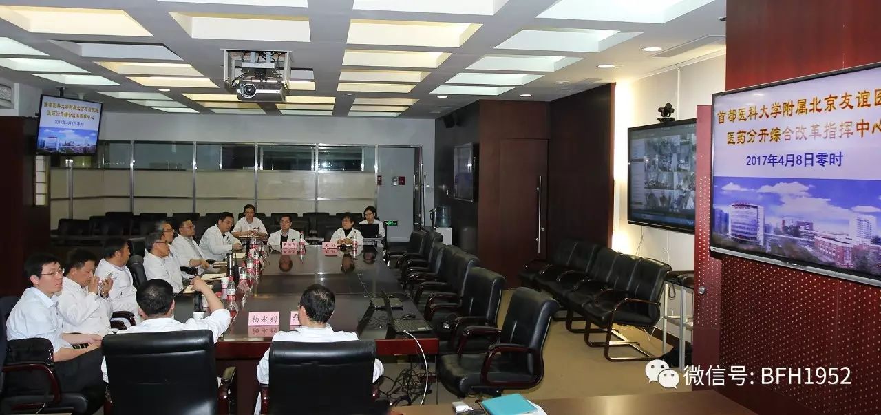 4月7日晚,在北京友谊医院门诊楼九层第一会议室的医药分开综合改革指挥现场,市医管局办公室副主任潘峰和北京友谊医院全体院领导坐镇指挥。