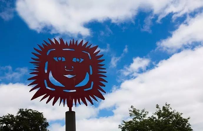 在他众多的剪纸作品中,最著名一幅作品当属“Solhoved”,就是太阳的大脑袋的意思。在安徒生故乡的很多地方都可以这幅作品的身影,砖瓦上,国王花园边,甚至坐火车时拿出丹麦铁路火车票,都可以看到那个太阳脑袋水印。