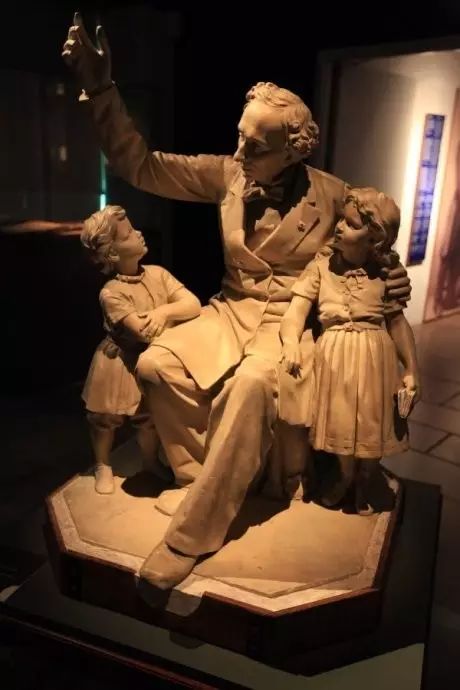 在丹麦奥登塞市的安徒生博物馆,我们可以看到这样一座雕像。安徒生坐在椅子上,身边围着两个小女孩,一个小女孩靠在他怀里,另一个则趴在他的腿上。安徒生的手高举着,像是在比划什么。而两个小女孩都全神贯注地看着他,被安徒生的故事深深吸引了。这座雕像所呈现的画面,就是当年安徒生给小朋友们讲故事的情景。