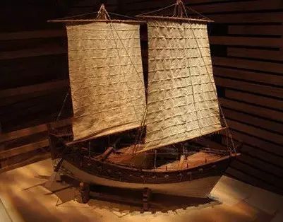 这就是黑石号原后的模型。这是一艘单桅缝合帆船,这种船的奇特之处就在于,整个船体不使用一根铁钉,而是用绳子缝合而成。这样的帆船没有引擎,全靠自然风力在海上航行。根据船体的材料和工艺,船舶专家断定,这艘船应该是阿拉伯造的。