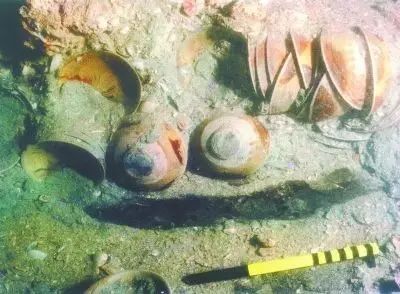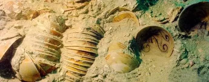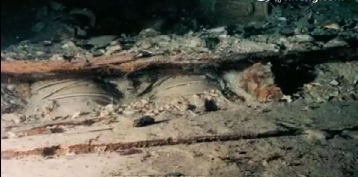 这些照片就是当时“黑石号”在水下被发现时的情景,整个船体被密密麻麻地布满了珊瑚和浮游生物,凝结成了厚厚一层的沉积物。即使这样,还是能隐约看见了船上满载的器物。