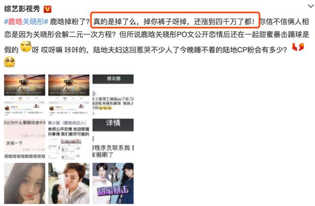 消息出来一个半小时,鹿晗微博据说掉粉26万。但不久就有媒体澄清,其实公布恋情之后,鹿晗的微博涨粉43万,估计路人被他的男友力圈粉;而关晓彤的微博也一下子涨粉44万…