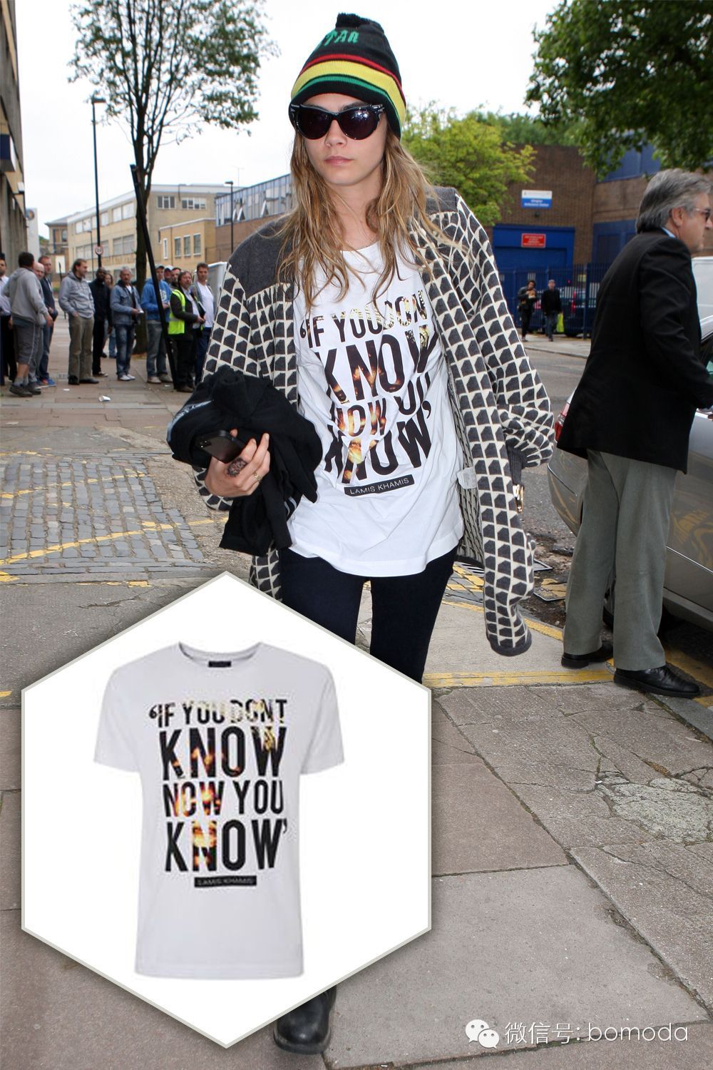 Lamis Khamis 这件标语T恤来自著名饶舌歌手Biggie Smalls的歌曲"Juicy"中的歌词,”If you don`t know Now you know" ——如果你不知道,那么现在你了解了!这么有个性的标语衫自然少不了Cara的穿着身影。
