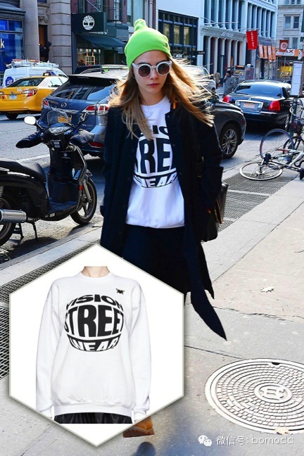 当你身处纽约的时候,你会不自然的被当地文化所影响。比如一向搞怪的英伦超模Cara便选择了这件来自纽约客Chloe Sevigny与潮牌Opening Ceremony联名的这款圆球视角卫衣。胸前的图案绝对让你不能不看