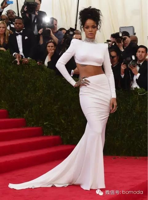 4. Rihanna这件分身白色礼服来自Stella McCartney, riri最近似乎格外喜欢短上衣,连参见晚宴都这么穿。只不过这件白上衣似乎短的快遮不住呼之欲出的胸部了。