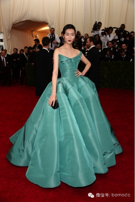 11. 作为顶级超模,刘雯也越来越多的出现在各种重大场合。这件Zac Posen的绿色伞形裙摆礼服裙,设计上绝对是符合Charles James的风格。