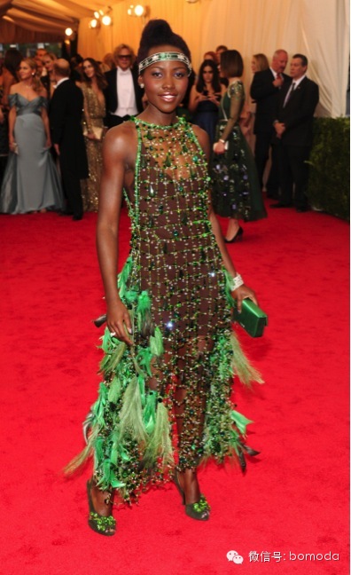 16. 刚刚被评为今年最会穿衣的女星Lupita Nyong`o,今年Met Gala就把媒体摆了一道——这件来自Prada的缀满羽毛装饰的渔网状礼服,让人不仅怀疑她是否以为这是来参加非洲部落的宴会活动。