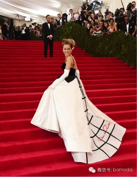 2. 作为纽约社交活动活跃分子,Sarah Jessica Parker一早就到了Met Gala,这件白色晚宴礼服后方长长的摆位上的标注,是Oscar de la Renta新款设计签名么?比起上次惊世骇俗的头饰,这样的晚宴似乎更适合“Carrie”。
