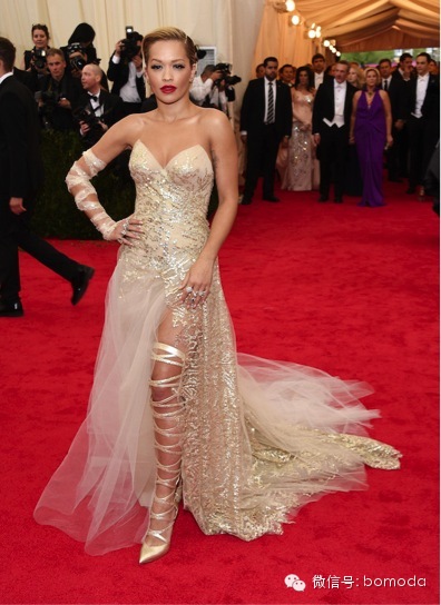 14. Rita Ora作为英国新晋时尚Icon,一贯穿衣都让人觉得惊艳,不过这回Met Gala就有点用力过猛——这件Donna Karen的定制款金色薄纱开叉礼服,搭配过膝款绑带高跟鞋,让人不仅好奇她收到的邀请函是不是去年的?