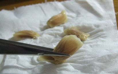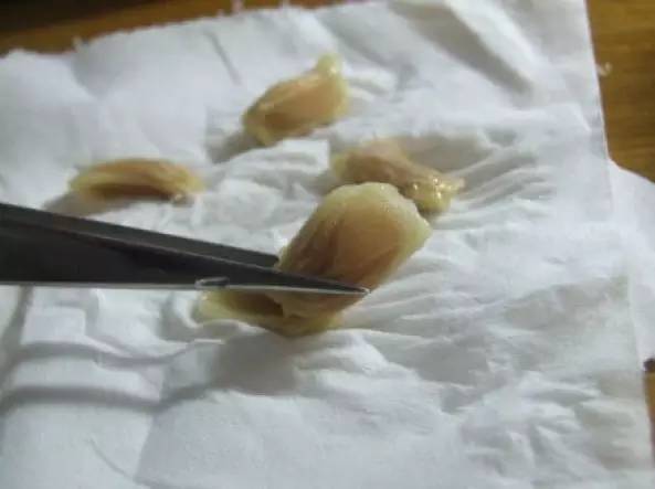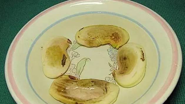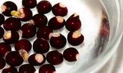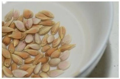 3.再用小刀小心剥除种子表面咖啡色薄膜,剥除后浸泡在水里,每天换水清除泡出的杂质。4天以后种子发芽。