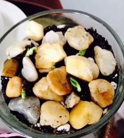 4.然后上面用粗砂或小石子盖上。也可以盖上保鲜膜,2到3天喷点水,一周左右发芽。