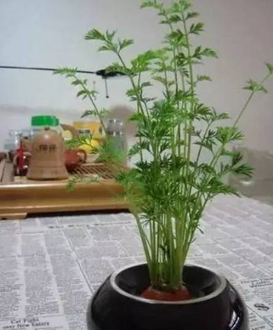 1.切下一大块胡萝卜头部,放在较细长的水器中,叶子会笔直地向上生长。